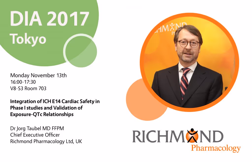 12th-14th November Tokyo Big SightRichmond Pharmacology is attending the DIA in Tokyo 2017: Toward Valuable Medicine Developments for Patients - Expectations for the Future through Effective Utilization of Artificial Intelligence and Big Data. Dr Taubel will presenting his latest scientific poster presentation - Integration of ICH E14 Cardiac Safety in Phase I studies and Validation of Exposure-QTc Relationships.