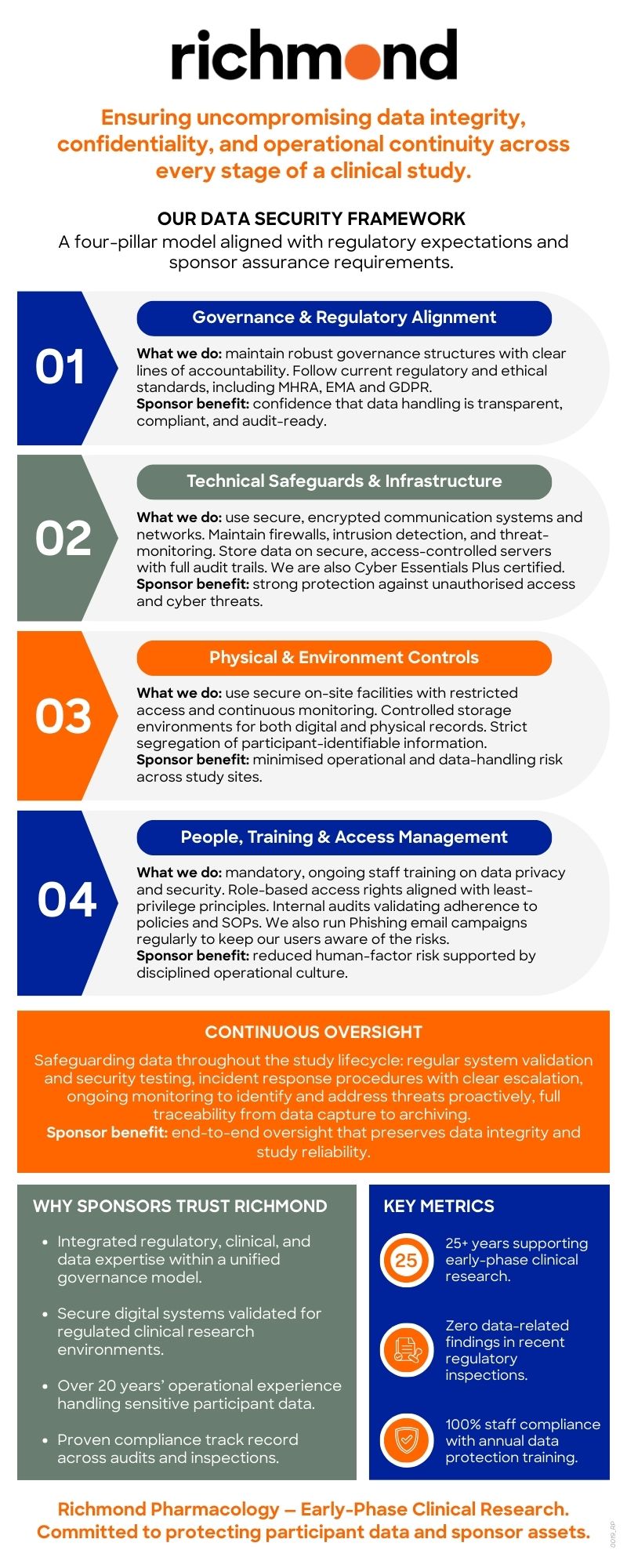 Richmond Pharmacology applies a comprehensive, four‑pillar data‑security framework designed to protect participant information and sponsor assets throughout every stage of a clinical study.